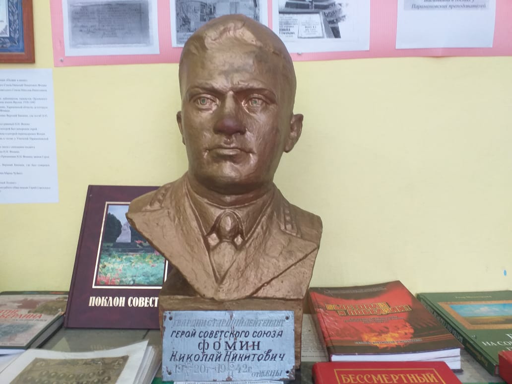1. Бюст Героя Советского Союза Николая Никитовича Фомина. Создан скульпторами. Бюст из гипса, окрашен под бронзу. Подлинник.